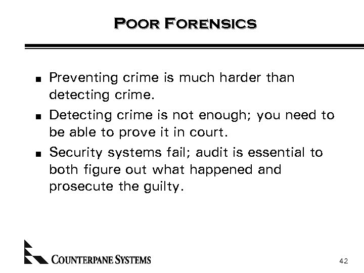 Poor Forensics n n n Preventing crime is much harder than detecting crime. Detecting crime is not enough; you need to be able to prove it in court. Security systems fail; audit is essential to both figure out what happened and prosecute the guilty. 42