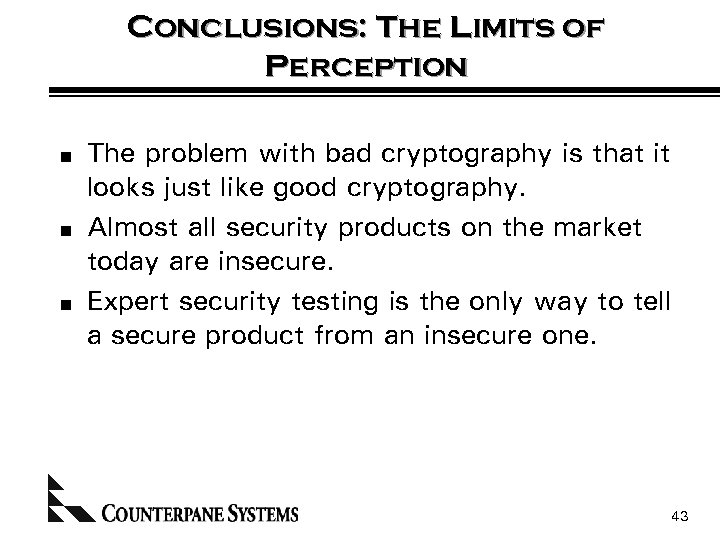 Conclusions: The Limits of Perception n The problem with bad cryptography is that it looks just like good cryptography. Almost all security products on the market today are insecure. Expert security testing is the only way to tell a secure product from an insecure one. 43