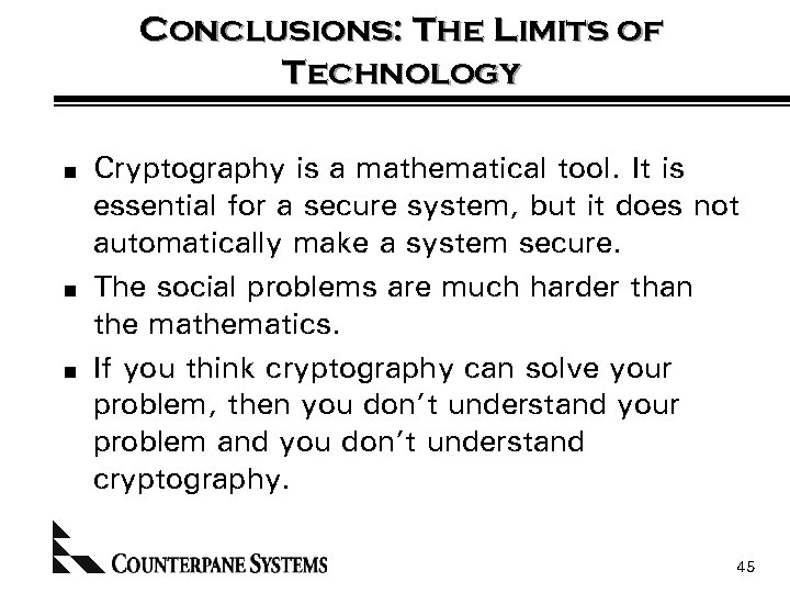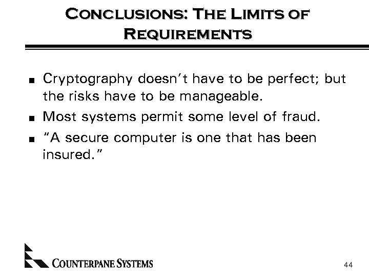 Conclusions: The Limits of Requirements n n n Cryptography doesn’t have to be perfect; but the risks have to be manageable. Most systems permit some level of fraud. “A secure computer is one that has been insured. ” 44
