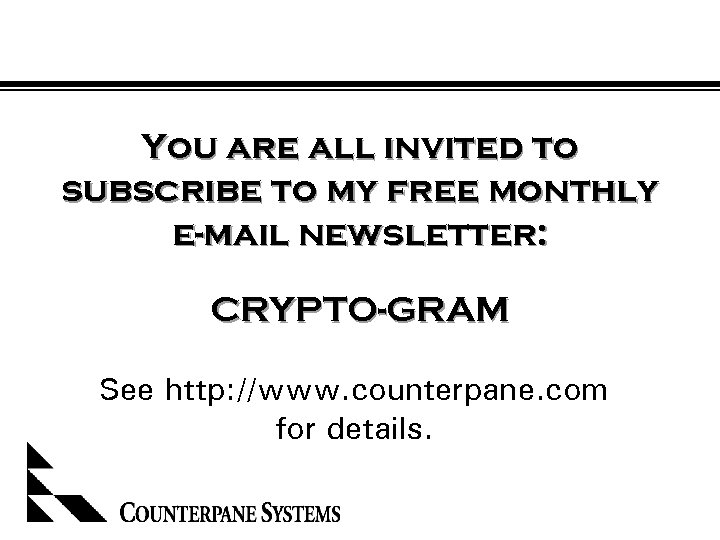 You are all invited to subscribe to my free monthly e-mail newsletter: CRYPTO-GRAM See http: //www. counterpane. com for details.