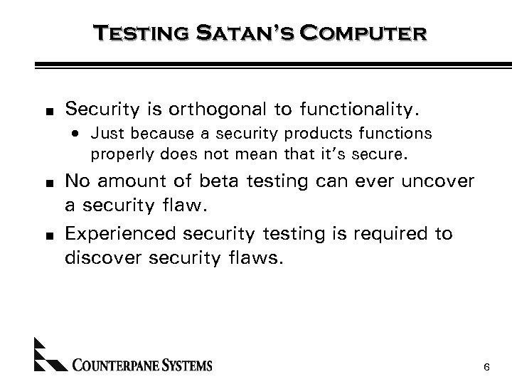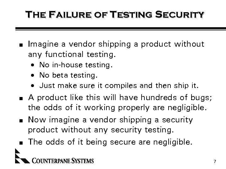 Testing Satan’s Computer n Security is orthogonal to functionality. · Just because a security products functions properly does not mean that it’s secure. n n No amount of beta testing can ever uncover a security flaw. Experienced security testing is required to discover security flaws. 6