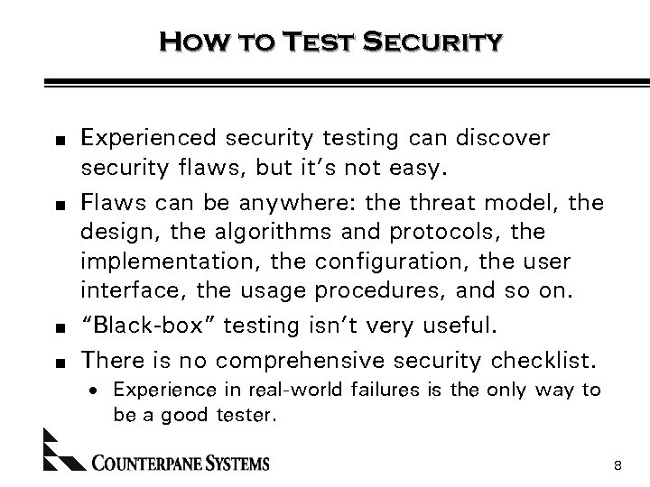 The Failure of Testing Security n Imagine a vendor shipping a product without any functional testing. · No in-house testing. · No beta testing. · Just make sure it compiles and then ship it. n n n A product like this will have hundreds of bugs; the odds of it working properly are negligible. Now imagine a vendor shipping a security product without any security testing. The odds of it being secure are negligible. 7