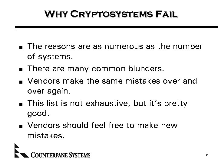 Why Cryptosystems Fail n n n The reasons are as numerous as the number of systems. There are many common blunders. Vendors make the same mistakes over and over again. This list is not exhaustive, but it’s pretty good. Vendors should feel free to make new mistakes. 9