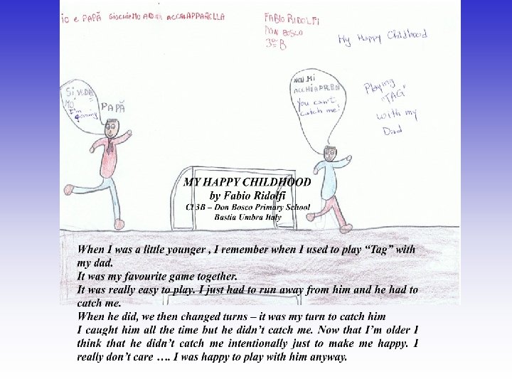 MY HAPPY CHILDHOOD By Eleonora Faloci Cl 3 c Don Bosco Primary School Bastia Umbra Italy When I was little I remember going to the park. My parents used to take me there when I was little. When my parents were working, then my grandparents used to take me. I remember this because I used to have a lot of fun there. There is this park near my school where you can go on the swings, the slides, on the seesaw, in a tree house or just run around and play there. I used to meet my friends there and play with them. Sometimes there were people doing their exercises in the park. When I was tired I used to sit on a bench and my grandmother used to tell me stories. I had a lot of fun !