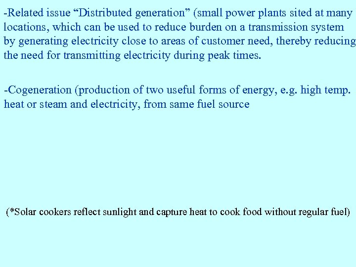 -Related issue “Distributed generation” (small power plants sited at many locations, which can be used to reduce burden on a transmission system by generating electricity close to areas of customer need, thereby reducing the need for transmitting electricity during peak times. -Cogeneration (production of two useful forms of energy, e. g. high temp. heat or steam and electricity, from same fuel source (*Solar cookers reflect sunlight and capture heat to cook food without regular fuel)