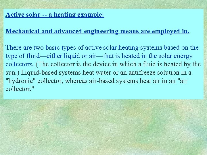 Active solar -- a heating example: Mechanical and advanced engineering means are employed in. There are two basic types of active solar heating systems based on the type of fluid—either liquid or air—that is heated in the solar energy collectors. (The collector is the device in which a fluid is heated by the sun. ) Liquid-based systems heat water or an antifreeze solution in a "hydronic" collector, whereas air-based systems heat air in an "air collector. "