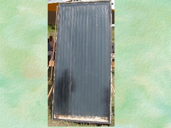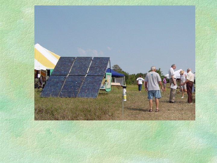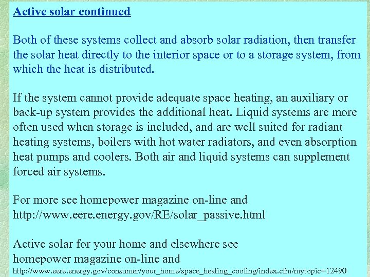 Active solar continued Both of these systems collect and absorb solar radiation, then transfer the solar heat directly to the interior space or to a storage system, from which the heat is distributed. If the system cannot provide adequate space heating, an auxiliary or back-up system provides the additional heat. Liquid systems are more often used when storage is included, and are well suited for radiant heating systems, boilers with hot water radiators, and even absorption heat pumps and coolers. Both air and liquid systems can supplement forced air systems. For more see homepower magazine on-line and http: //www. eere. energy. gov/RE/solar_passive. html Active solar for your home and elsewhere see homepower magazine on-line and http: //www. eere. energy. gov/consumer/your_home/space_heating_cooling/index. cfm/mytopic=12490
