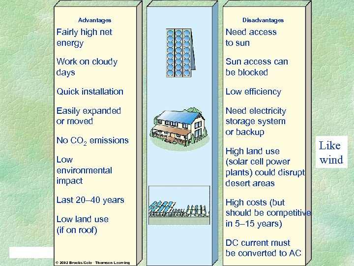 Advantages Disadvantages Fairly high net energy Need access to sun Work on cloudy days Sun access can be blocked Quick installation Low efficiency Easily expanded or moved Need electricity storage system or backup No CO 2 emissions Low environmental impact Last 20– 40 years Low land use (if on roof) High land use (solar cell power plants) could disrupt desert areas High costs (but should be competitive in 5– 15 years) DC current must be converted to AC Like wind