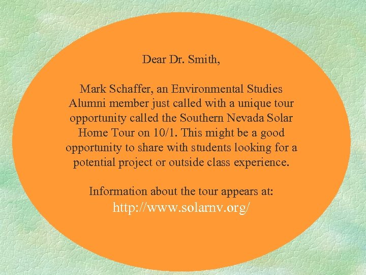 Dear Dr. Smith, Mark Schaffer, an Environmental Studies Alumni member just called with a unique tour opportunity called the Southern Nevada Solar Home Tour on 10/1. This might be a good opportunity to share with students looking for a potential project or outside class experience. Information about the tour appears at: http: //www. solarnv. org/