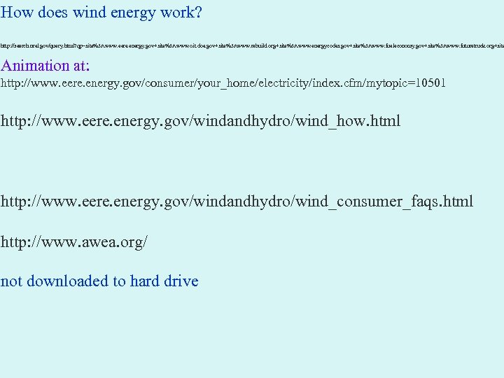 How does wind energy work? http: //search. nrel. gov/query. html? qp=site%3 Awww. eere. energy. gov+site%3 Awww. oit. doe. gov+site%3 Awww. rebuild. org+site%3 Awww. energycodes. gov+site%3 Awww. fueleconomy. gov+site%3 Awww. futuretruck. org+site Animation at: http: //www. eere. energy. gov/consumer/your_home/electricity/index. cfm/mytopic=10501 http: //www. eere. energy. gov/windandhydro/wind_how. html http: //www. eere. energy. gov/windandhydro/wind_consumer_faqs. html http: //www. awea. org/ not downloaded to hard drive