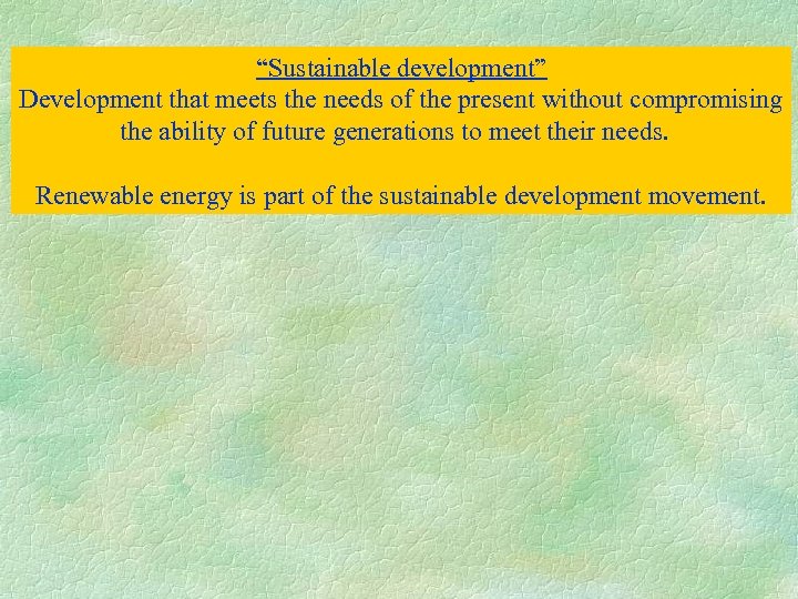 “Sustainable development” Development that meets the needs of the present without compromising the ability of future generations to meet their needs. Renewable energy is part of the sustainable development movement.