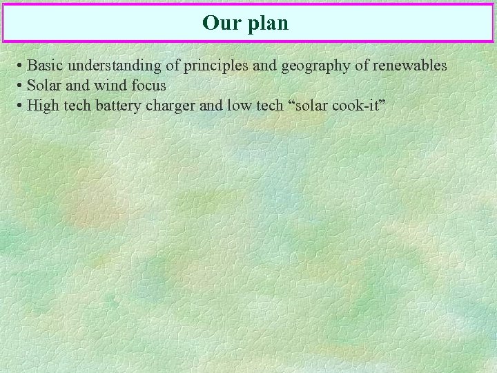 Our plan • Basic understanding of principles and geography of renewables • Solar and wind focus • High tech battery charger and low tech “solar cook-it”