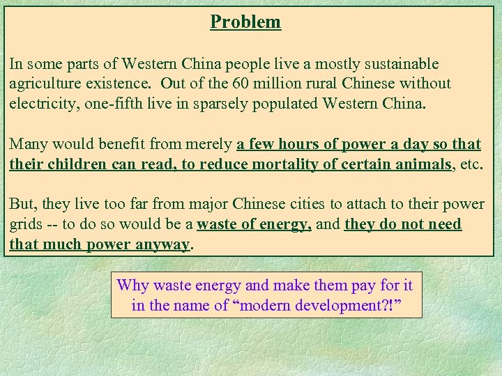 Problem In some parts of Western China people live a mostly sustainable agriculture existence. Out of the 60 million rural Chinese without electricity, one-fifth live in sparsely populated Western China. Many would benefit from merely a few hours of power a day so that their children can read, to reduce mortality of certain animals, etc. But, they live too far from major Chinese cities to attach to their power grids -- to do so would be a waste of energy, and they do not need that much power anyway. Why waste energy and make them pay for it in the name of “modern development? !”