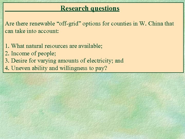 Research questions Are there renewable “off-grid” options for counties in W. China that can take into account: 1. What natural resources are available; 2. Income of people; 3. Desire for varying amounts of electricity; and 4. Uneven ability and willingness to pay?