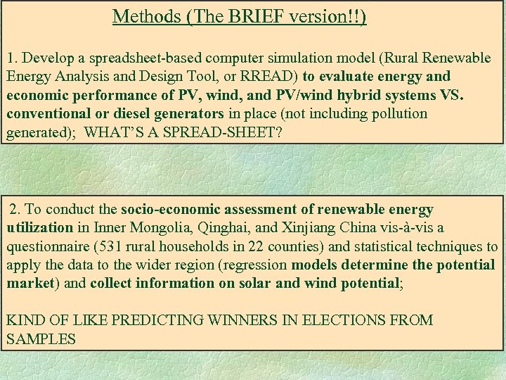 Methods (The BRIEF version!!) 1. Develop a spreadsheet-based computer simulation model (Rural Renewable Energy Analysis and Design Tool, or RREAD) to evaluate energy and economic performance of PV, wind, and PV/wind hybrid systems VS. conventional or diesel generators in place (not including pollution generated); WHAT’S A SPREAD-SHEET? 2. To conduct the socio-economic assessment of renewable energy utilization in Inner Mongolia, Qinghai, and Xinjiang China vis-à-vis a questionnaire (531 rural households in 22 counties) and statistical techniques to apply the data to the wider region (regression models determine the potential market) and collect information on solar and wind potential; KIND OF LIKE PREDICTING WINNERS IN ELECTIONS FROM SAMPLES