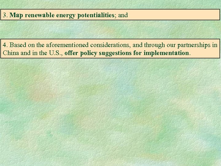 3. Map renewable energy potentialities; and 4. Based on the aforementioned considerations, and through our partnerships in China and in the U. S. , offer policy suggestions for implementation.