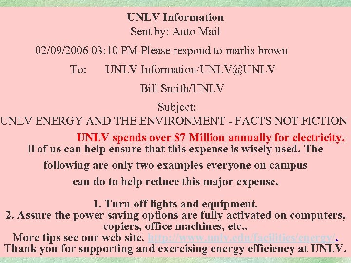 UNLV Information Sent by: Auto Mail 02/09/2006 03: 10 PM Please respond to marlis brown To: UNLV Information/UNLV@UNLV Bill Smith/UNLV Subject: UNLV ENERGY AND THE ENVIRONMENT - FACTS NOT FICTION UNLV spends over $7 Million annually for electricity. ll of us can help ensure that this expense is wisely used. The following are only two examples everyone on campus can do to help reduce this major expense. 1. Turn off lights and equipment. 2. Assure the power saving options are fully activated on computers, copiers, office machines, etc. . More tips see our web site. http: //www. unlv. edu/facilities/energy/. Thank you for supporting and exercising energy efficiency at UNLV.