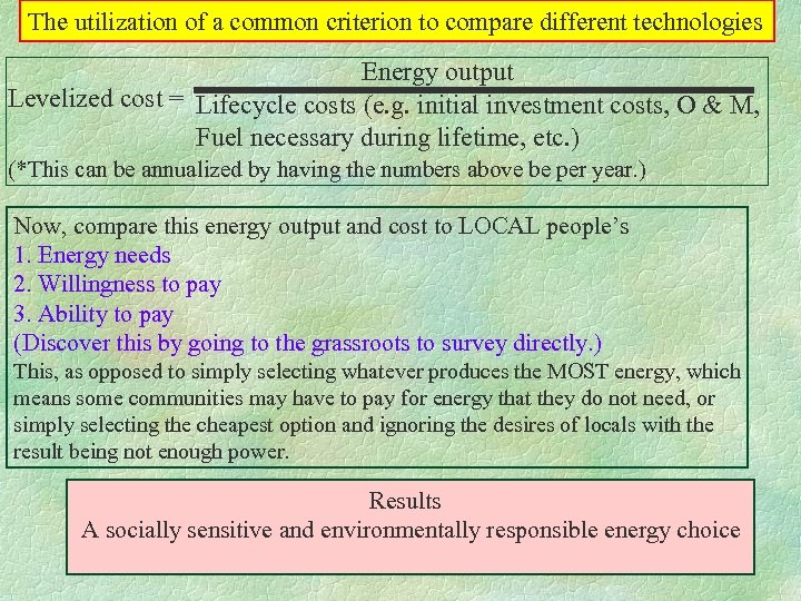 The utilization of a common criterion to compare different technologies Energy output Levelized cost = Lifecycle costs (e. g. initial investment costs, O & M, Fuel necessary during lifetime, etc. ) (*This can be annualized by having the numbers above be per year. ) Now, compare this energy output and cost to LOCAL people’s 1. Energy needs 2. Willingness to pay 3. Ability to pay (Discover this by going to the grassroots to survey directly. ) This, as opposed to simply selecting whatever produces the MOST energy, which means some communities may have to pay for energy that they do not need, or simply selecting the cheapest option and ignoring the desires of locals with the result being not enough power. Results A socially sensitive and environmentally responsible energy choice
