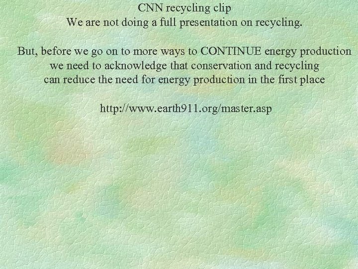 CNN recycling clip We are not doing a full presentation on recycling. But, before we go on to more ways to CONTINUE energy production we need to acknowledge that conservation and recycling can reduce the need for energy production in the first place http: //www. earth 911. org/master. asp