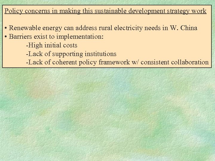 Policy concerns in making this sustainable development strategy work • Renewable energy can address rural electricity needs in W. China • Barriers exist to implementation: -High initial costs -Lack of supporting institutions -Lack of coherent policy framework w/ consistent collaboration