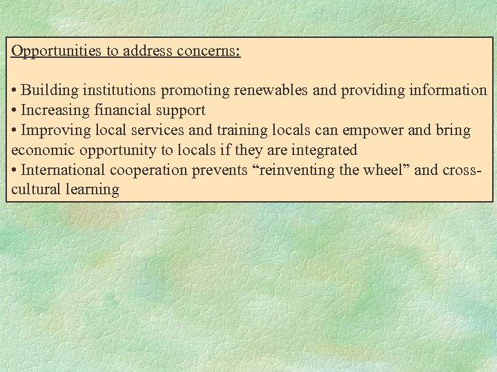 Opportunities to address concerns: • Building institutions promoting renewables and providing information • Increasing financial support • Improving local services and training locals can empower and bring economic opportunity to locals if they are integrated • International cooperation prevents “reinventing the wheel” and crosscultural learning