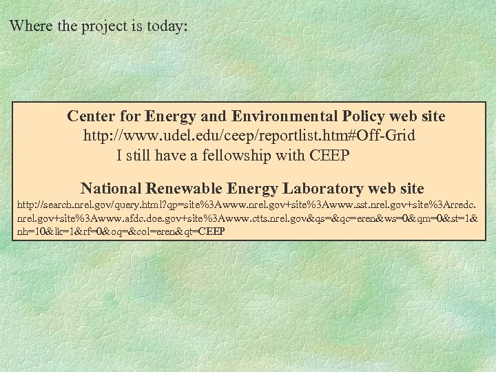 Where the project is today: Center for Energy and Environmental Policy web site http: //www. udel. edu/ceep/reportlist. htm#Off-Grid I still have a fellowship with CEEP National Renewable Energy Laboratory web site http: //search. nrel. gov/query. html? qp=site%3 Awww. nrel. gov+site%3 Awww. sst. nrel. gov+site%3 Arredc. nrel. gov+site%3 Awww. afdc. doe. gov+site%3 Awww. ctts. nrel. gov&qs=&qc=eren&ws=0&qm=0&st=1& nh=10&lk=1&rf=0&oq=&col=eren&qt=CEEP