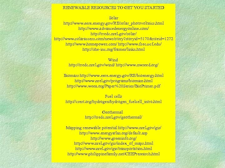 RENEWABLE RESOURCES TO GET YOU STARTED Solar http: //www. eere. energy. gov/RE/solar_photovoltaics. html http: //www. advancedenergyonline. com/ http: //rredc. nrel. gov/solar/ http: //www. solaraccess. com/news/story? storyid=5170&siteid=1272 http: //www. homepower. com/ http: //www. fsec. ucf. edu/ http: //she-inc. org/frames/links. html Wind http: //rredc. nrel. gov/wind/ http: //www. nwseed. org/ Biomass http: //www. eere. energy. gov/RE/bioenergy. html http: //www. nrel. gov/programs/biomass. html http: //www. weea. org/Paper%20 Series/Bio. Primer. pdf Fuel cells http: //crest. org/hydrogen_fuelcell_intro. html Geothermal http: //rredc. nrel. gov/geothermal/ Mapping renewable potential http: //www. nrel. gov/gis/ http: //www. energyatlas. org/default. asp http: //www. greeninfo. org/ http: //www. nrel. gov/gis/index_of_maps. html http: //www. nrel. gov/gis/transportation. html http: //www. philippinefamily. net/CEEPresearch. html