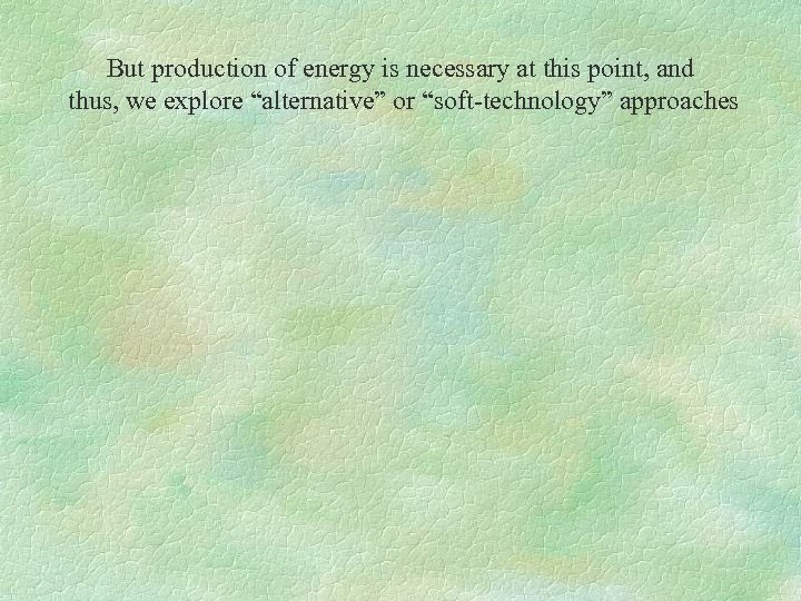 But production of energy is necessary at this point, and thus, we explore “alternative” or “soft-technology” approaches