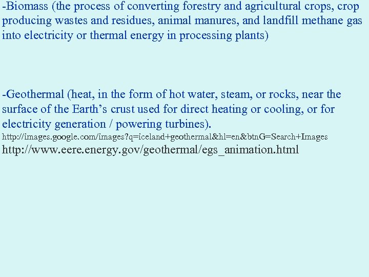 -Biomass (the process of converting forestry and agricultural crops, crop producing wastes and residues, animal manures, and landfill methane gas into electricity or thermal energy in processing plants) -Geothermal (heat, in the form of hot water, steam, or rocks, near the surface of the Earth’s crust used for direct heating or cooling, or for electricity generation / powering turbines). http: //images. google. com/images? q=iceland+geothermal&hl=en&btn. G=Search+Images http: //www. eere. energy. gov/geothermal/egs_animation. html