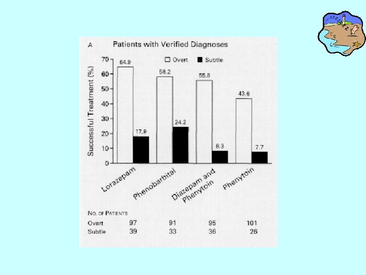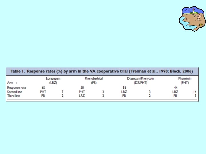 A Comparison of four treatments for generalized convulsive SE A five-year randomized, double-blind, multicenter trial of four iv regimens in 518 patients with generalized convulsive SE( overt or subtle): • 1. diazepam(0. 15 mg/kg) followed by phenytoin(18 mg/kg), • 2. lorazepam(0. 1 mg/kg) • 3. phenobarbital (15 mg/kg) • 4. phenytoin(18 mg/kg) – Treiman et al. Veterans Affairs Status Epilepticus Cooperative Study. NEJM 1998; 339: 792 -8