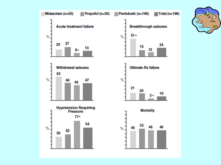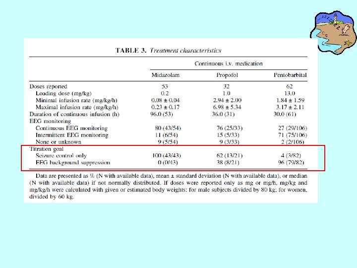 • A meta-analysis of 28 articles that included 193 adults with RSE compared pentobarbital, midazolem, and propofol. • Pentobarbital was associated with a sig. lower incidence of short-term treatment failure, breakthrough seizures, and the need to change to a different medication, but was also associated with a sig higher f of hypotension. • However, patients treated with pentobarbital tended to be treated to the point of burst suppression, whereas those treated with midazolam or propofol tended to be treated to seizure suppression. – Claasen, Hirsch. Epildepsia 2002; 43: 146 -53.
