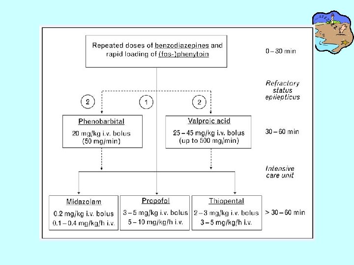 Anticonvulsants • First- line : benzodiazepines (diazepam, lorazepam) • Second-line: phenytoin/ fosphenytoin, valproic acid, phenobarbital • RSE: iv anaesthetics : midazolam, propofol, barbiturates( thiopental, pentobarbital); inhalational anaesthetics(isoflurane, desflurane); nonanaesthetic: topiramate and levetiracetam.