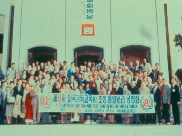 History § After his family converted to Presbyterianism when he was 11, the young Reverend Moon attended the Methodist church, and later more charismatic Korean churches. Church group in Seoul. Rev. Moon is standing second from right.