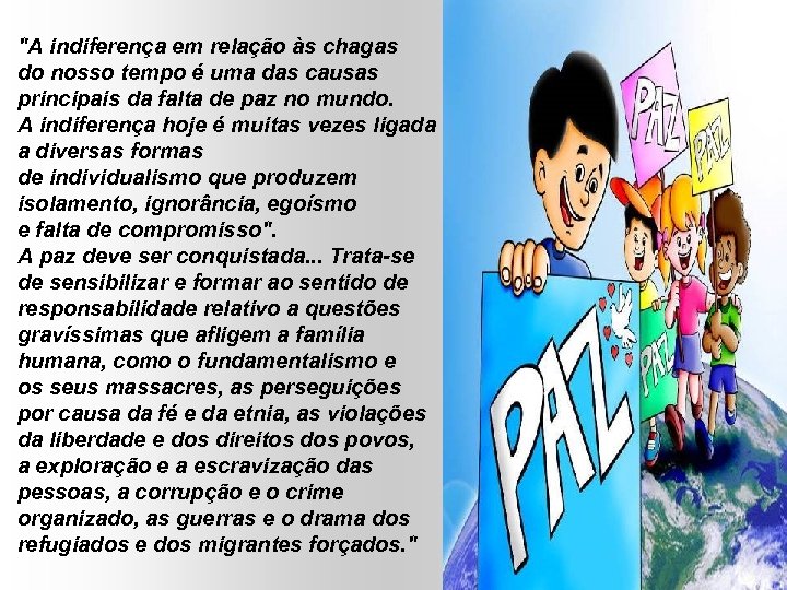 "A indiferença em relação às chagas do nosso tempo é uma das causas principais da falta de paz no mundo. A indiferença hoje é muitas vezes ligada a diversas formas de individualismo que produzem isolamento, ignorância, egoísmo e falta de compromisso". A paz deve ser conquistada. . . Trata-se de sensibilizar e formar ao sentido de responsabilidade relativo a questões gravíssimas que afligem a família humana, como o fundamentalismo e os seus massacres, as perseguições por causa da fé e da etnia, as violações da liberdade e dos direitos dos povos, a exploração e a escravização das pessoas, a corrupção e o crime organizado, as guerras e o drama dos refugiados e dos migrantes forçados. "