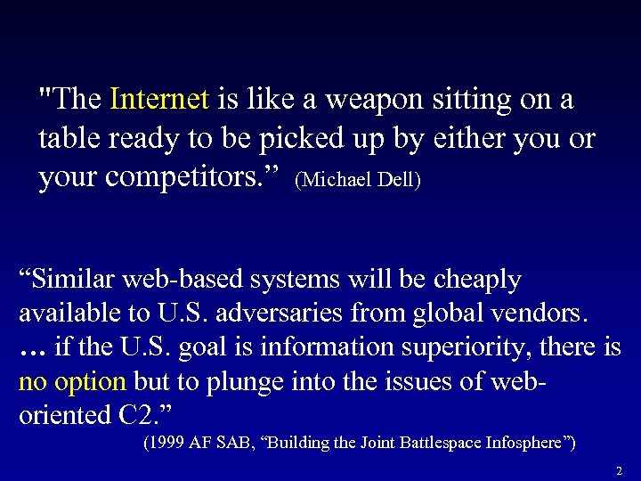 "The Internet is like a weapon sitting on a table ready to be picked up by either you or your competitors. ” (Michael Dell) “Similar web-based systems will be cheaply available to U. S. adversaries from global vendors. … if the U. S. goal is information superiority, there is no option but to plunge into the issues of weboriented C 2. ” (1999 AF SAB, “Building the Joint Battlespace Infosphere”) 2