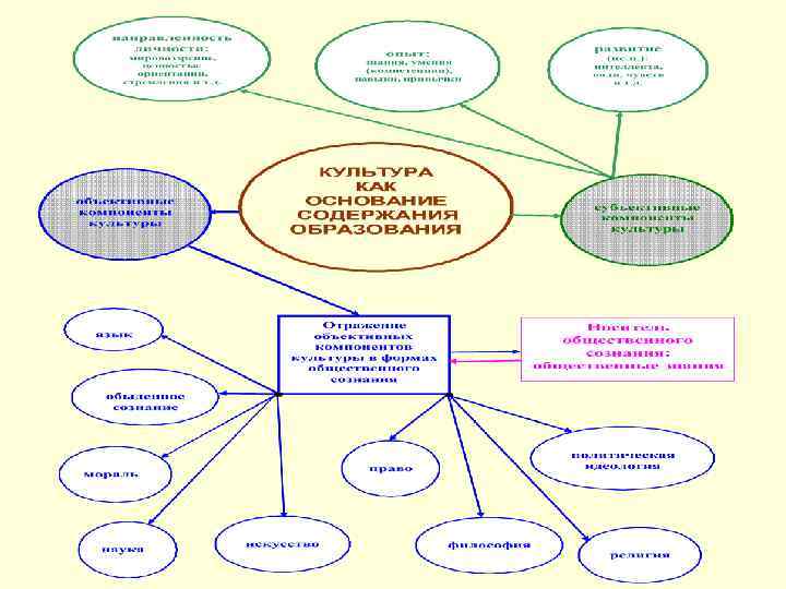 ЗАКОН НАСЛЕДОВАНИЯ КУЛЬТУРЫ: ЧЕЛОВЕК В ПРОЦЕССЕ ОБРАЗОВАНИЯ ОСВАИВАЕТ КУЛЬТУРУ ЧЕЛОВЕЧЕСТВА. В самом общем виде цель образования человека заключается в освоении (трансляции) культуры. Все остальные проблемы заключаются в том – как этого достичь. Культура (филос. энцикл. словарь) включает в себя: - во-первых, объективные результаты деятельности людей (машины, технические сооружения, книги, произведения искусства, нормы права и морали и т. д. Предметные результаты деятельности человечества отражаются в формах общественного сознания: язык (естественный родной и иностранные языки, искусственные языки), обыденное сознание, политическая идеология, право, мораль, религия, искусство, наука, философия; - во-вторых, субъективные человеческие силы и способности, реализуемые в деятельности каждого человека (ощущения, восприятия, знания, умения, производственные и профессиональные навыки, уровень интеллектуального, эстетического и нравственного развития, мировоззрение, способы и формы взаимного общения людей и т. д. ).