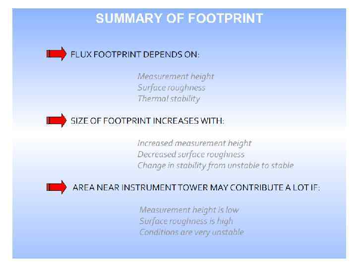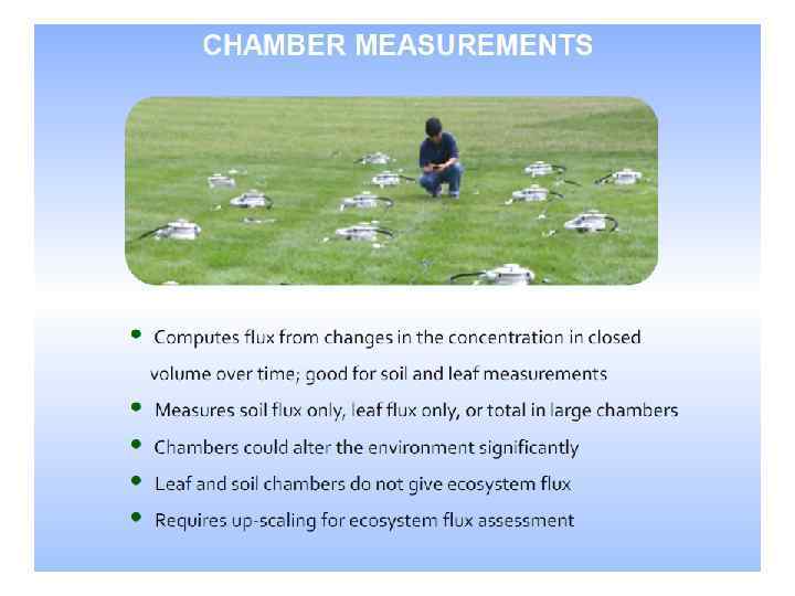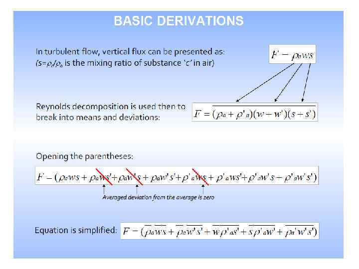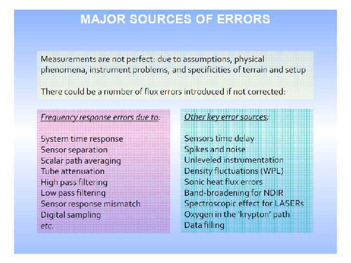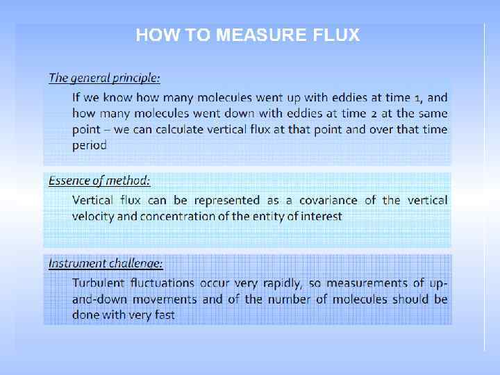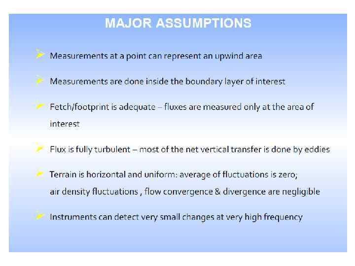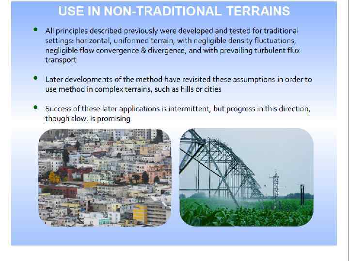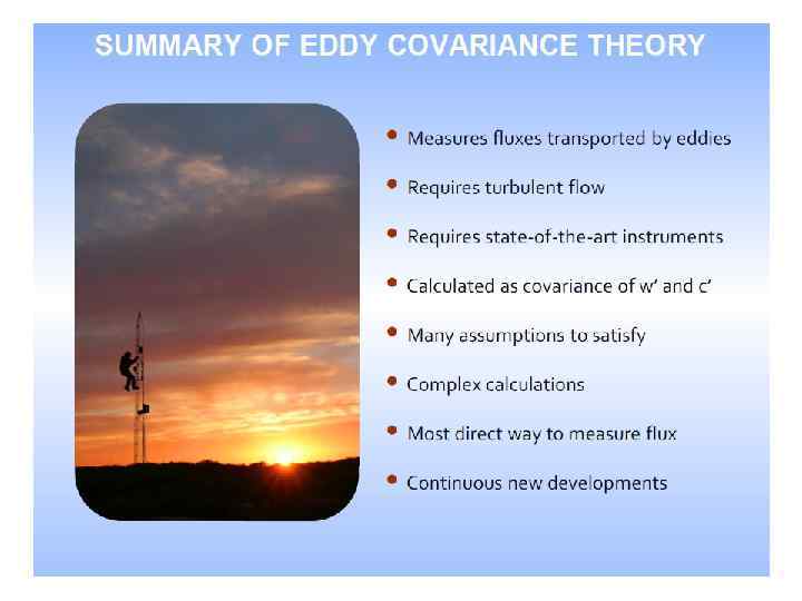 EDDY COVARIANCE method Flux measurements State of methodology Air flow in ecosystems How to measure flux Derivation of main equation Major assumptions Major sources of errors Error treatment overview Use in non-traditional terrains Summary of EC theory
