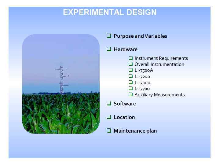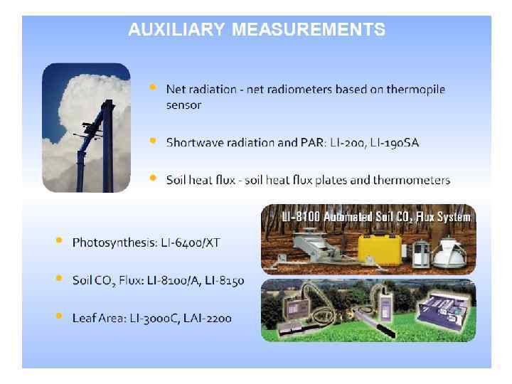 методы исследования Схема и основные датчики измерительного комплекса ФАР Измерительный комплекс Температура воздуха Скорость и направление ветра Потоки радиации 60 м Высокочастотные измерения скорости ветра Концентрация СО 2 и Н 2 О 40 м Давление Энергообеспечение Сохранение данных Газоанализатор Почвенное дыхание Осадки Уровень грунтовых вод Поток тепла в почву Температура почвы