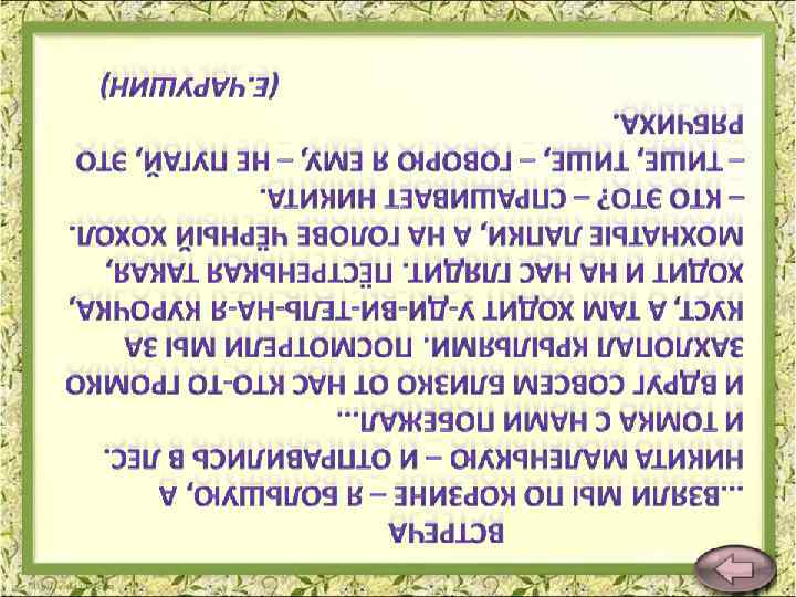 Неожиданная встреча По садовой ДРОКОЖЕ тихо шлёпал ножками ЁИЖК. Навстречу шли дети. «Стоп, ёжик!» – КУРКИНЛ Петя и достал шапочку. Из-за пенька выглянул СИРОЧАТК-лесовичок и тихо пропищал: «Не обижайте колючего КОБОКЛА, дети!» Малыши притихли. На дорожке ФАРЧЫЛ клубок иголок, среди ветвей мелькала СРОКОА, из дупла выглянула БОЧЛЕКА. «Кто это? » – спросил Вася. Испугались мальчишки и пустились наутёк. А ЁИЖК спокойно отправился ДМООЙ.