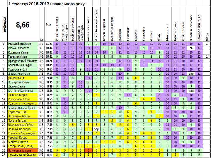 РЕЙТИНГ 1(5) 2(6) 3(7)1 семестр 8, 99 8, 66 Місце у паралелі 2 2 1 Місце у гімназії 5 Рейтинг класу 10