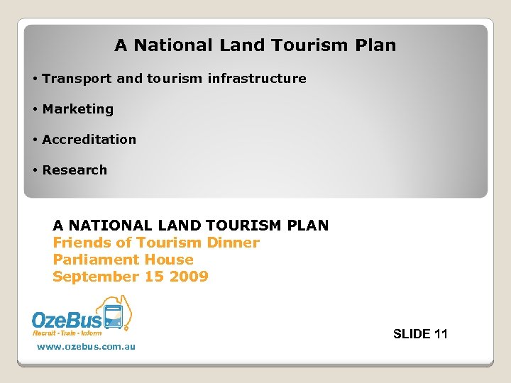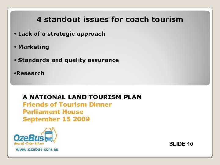 4 standout issues for coach tourism • Lack of a strategic approach • Marketing • Standards and quality assurance • Research A NATIONAL LAND TOURISM PLAN Friends of Tourism Dinner Parliament House September 15 2009 SLIDE 10 www. ozebus. com. au