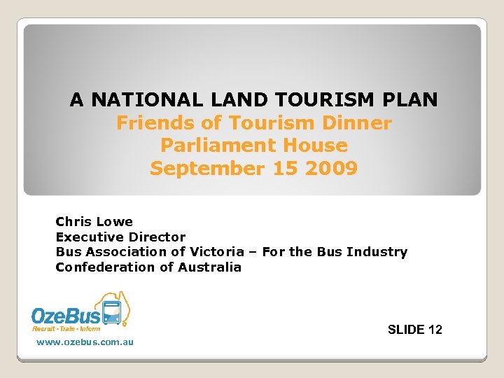 A NATIONAL LAND TOURISM PLAN Friends of Tourism Dinner Parliament House September 15 2009 Chris Lowe Executive Director Bus Association of Victoria – For the Bus Industry Confederation of Australia SLIDE 12 www. ozebus. com. au