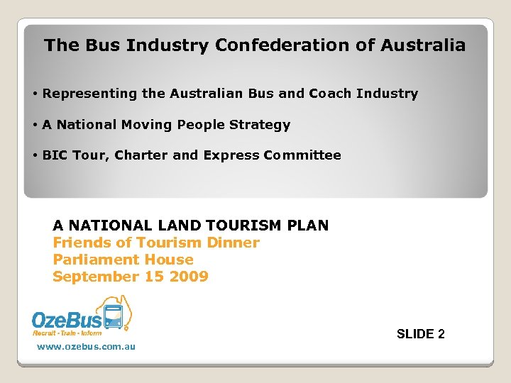 The Bus Industry Confederation of Australia • Representing the Australian Bus and Coach Industry • A National Moving People Strategy • BIC Tour, Charter and Express Committee A NATIONAL LAND TOURISM PLAN Friends of Tourism Dinner Parliament House September 15 2009 SLIDE 2 www. ozebus. com. au
