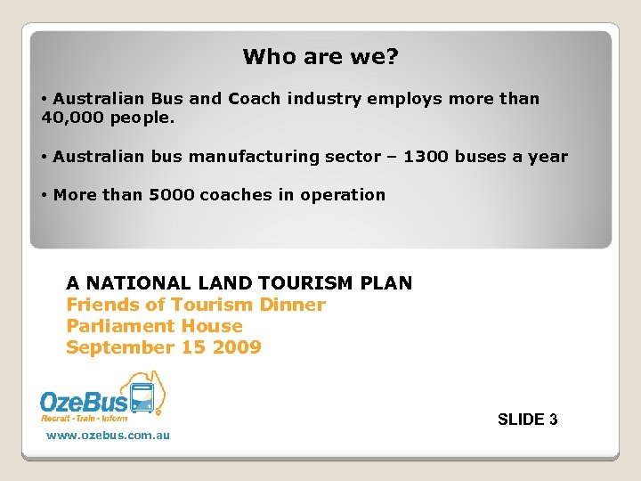 Who are we? • Australian Bus and Coach industry employs more than 40, 000 people. • Australian bus manufacturing sector – 1300 buses a year • More than 5000 coaches in operation A NATIONAL LAND TOURISM PLAN Friends of Tourism Dinner Parliament House September 15 2009 SLIDE 3 www. ozebus. com. au