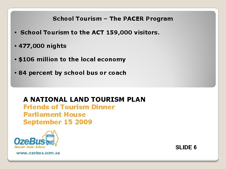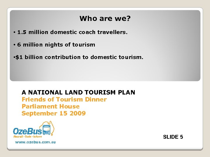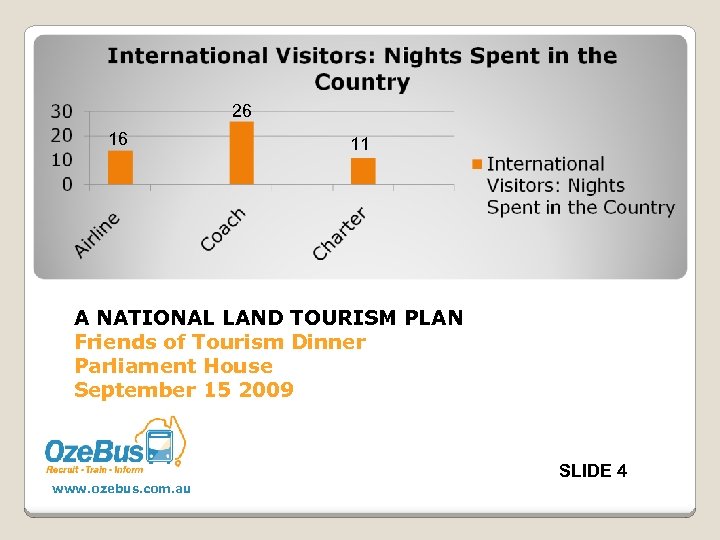 26 16 11 A NATIONAL LAND TOURISM PLAN Friends of Tourism Dinner Parliament House September 15 2009 SLIDE 4 www. ozebus. com. au