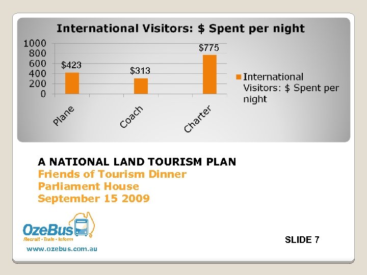 $775 $423 $313 A NATIONAL LAND TOURISM PLAN Friends of Tourism Dinner Parliament House September 15 2009 SLIDE 7 www. ozebus. com. au