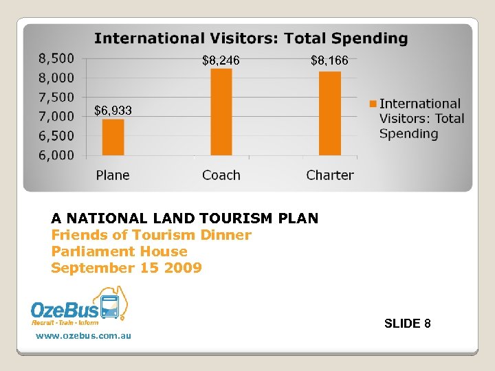$8, 246 $8, 166 $6, 933 A NATIONAL LAND TOURISM PLAN Friends of Tourism Dinner Parliament House September 15 2009 SLIDE 8 www. ozebus. com. au