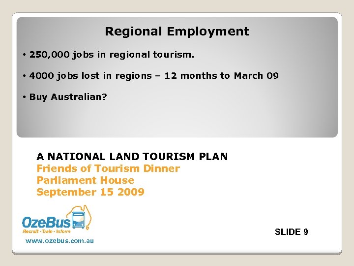 Regional Employment • 250, 000 jobs in regional tourism. • 4000 jobs lost in regions – 12 months to March 09 • Buy Australian? A NATIONAL LAND TOURISM PLAN Friends of Tourism Dinner Parliament House September 15 2009 SLIDE 9 www. ozebus. com. au