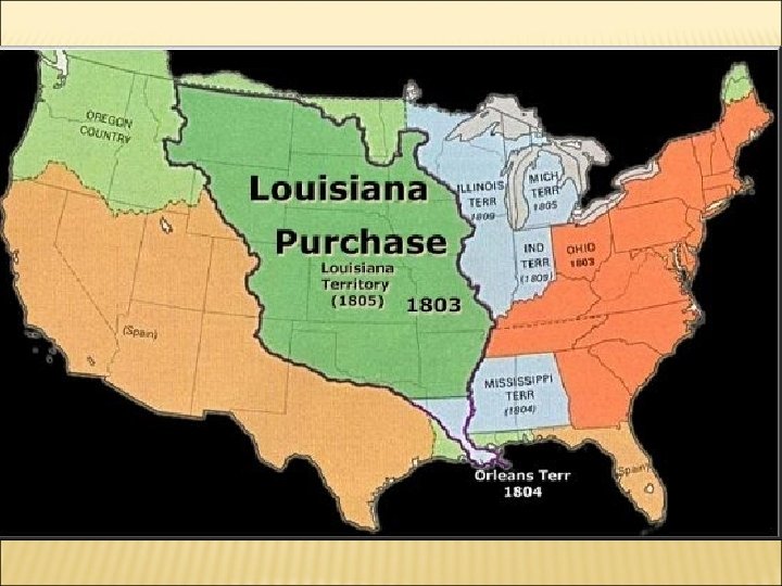 LOUISIANA PURCHASE v 1803 – Spain returns Louisiana territory to France v Jefferson fears French influence in middle of America - May force an alliance with hated British - No more access to Mississippi for farmers - Expansion plans for America endangered v Offers to buy west Fl & New Orleans…meantime v Napoleon loses Haiti & needs money for war vs. English v Sells whole territory for $15 Million