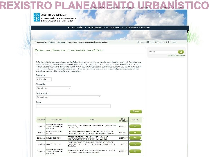 Lei 2/2016, do 10 de febreiro, do Solo de Galicia (artgo. 45 LSG/16): PLAN BÁSICO AUTONÓMICO (artgo. 49). desenvolto por: PLANS BÁSICOS MUNICIPAIS (artgo. 63). admite redacción de: PLANS ESPECIAIS (artgo. 177. 4 RLSG/16). PLAN XERAL DE ORDENACIÓN MUNICIPAL (artgo. 51). desenvolto por: PLANS PARCIAIS (artgo. 67). PLANS ESPECIAIS (artgo. 70). ESTUDOS DE DETALLE (artgo. 79). DELIMITACIÓNS DO SOLO DE NÚCLEO RURAL (artgo. 78). CONCELLOS SEN PLANEAMENTO (artgo. 177. 4 RLSG/16). admite redacción de: PLANS ESPECIAIS (artgo. 177. 4 RLSG/16).
